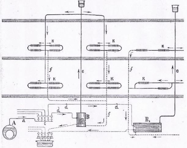 Паровой котел А производит пар давлением порядка 1 ати. По паропроводу a через коллектор с производится распределение пара через паропроводы d к так называемым нагревательным цилиндрам В, В1. Эти цилиндры являются источниками тепла для выделенных контуров систем водяного отопления различных частей здания. Системы отопления могут быть вертикальными и горизонтальными. В цилиндре B пар проходит через трубки змеевика, расположенного в объеме цилиндра. Охлажденная в приборах отопления К вода опускается по обратным теплопроводам f вниз, попадает в нижнюю часть цилиндра, нагревается змеевиком с паром, поднимается по главному подъемному стояку е и поступает сверху к приборам отопления К. Циркуляция воды в контуре системы отопления естественная, движущей силой является подъемная сила Архимеда, действующая на нагретую воду.