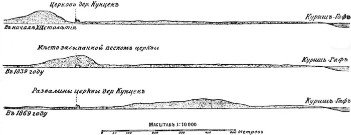 История каждой деревни на Куршской косе обусловлена странствованием дюн. Последние отодвигают изменения самого берега на второй план, хотя около Кранца, по-видимому, целое кладбище упало, благодаря оползню, в море. Отдельные поселки исчезли здесь бесследно, подобно Латтенвальду и Кунцену, некогда лежавшим между Кранцем и Росситтеном.