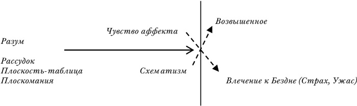В эстетике возвышенного должно быть снято кантовское разделение между phaenomena и noumena: одни даны на плоскости и могут быть схематизированы, сведены в таблицы, другие, напротив, недоступны именно потому, что они располагаются на невидимой вертикали, т. е. там, где линия горизонта исчезает и тем самым действие плоскостных образов останавливается. Гегель для большей достоверности своей критики кантовского схематизма обращается к живописи:
