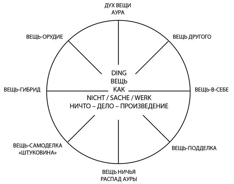 Вот почему я решил расположить в центре диаграммы вещь так, как если бы она определялась, но оставалась неопределённой. Мы установили двойной дискурс вещи и закрепили его определение: посредством расширительно толкуемой созерцательной практики. Но есть ещё и практика использования. В этом противоречивом горизонте существует вещь и вся её метафизика (и наконец, наша способность её определить). Выделенная на рисунке плана-карты вещь может читаться одновременно в многообразии актов созерцания и использования. Главная оппозиция: вещь, которая возникает и «живёт» в ауре прикосновений, взглядов, касаний, дыхания, колебаний, – всего растворяющего вещь движения, похожего на поток; а с другой стороны, вещь, которая уничтожается в опыте снятия всех её культовых и наследуемых качеств; так она становится ничейной, существующей вне собственной ауры. Теперь она лишена времени созерцания и существует только одно мгновение, и это время исчезновения самой вещи. Bещь-с-аурой и вещь-без-ауры – два крайних предела, в которых возможен поиск определения вещи, т. е. ответа на вопрос: что такое Вещь26.