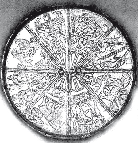 Скифское зеркало VII в. до н. э. Как считают некоторые исследователи, на нем изображен скифский восьмичастный мифологический календарь: львы, грифоны, змееногая богиня Апи, от которой, по легенде, произошли скифы и др.