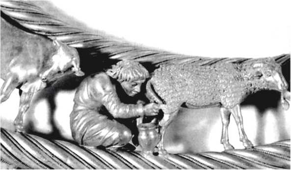 Верхний ряд изображений посвящен скотоводству. Скифы разводили овец и лошадей, позднее появились и стада коров. Это обусловливалось самой природой скифского мира. Племена скифской культуры расселялись в полосе степей, лесостепей и полупустынь, где кочевой образ жизни оказывался наиболее приемлемым способом адаптации к условиям окружающей среды. Земледелие в этих областях было возможно, но недостаток воды, постоянные засухи, суровые зимы, особенно в степях к востоку от Волги, делали это занятие весьма рискованным