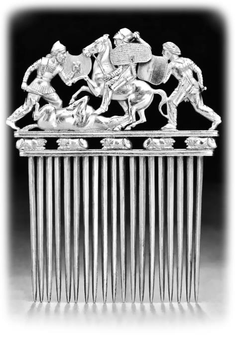 Новшество было очень полезным для скотоводов. Верхом можно пасти большие стада в степях, перегонять их на большие расстояния. Но это достижение сказалось и в военном деле. У киммерийцев появилась кавалерия. До сих пор главной боевой силой были колесницы. Разве могли они сравниться с конницей? Будут дёргаться, неуклюже разворачиваться, а всадники их обскачут, окружат, перебьют воинов в повозке. Греческие рисунки сохранили, как выглядели киммерийцы. Несутся во весь опор лихие всадники, рубят врагов. Они очень похожи на казаков. На головах папахи, одеты в кафтаны, подпоясанные кушаками. Только в руках вместо сабель – длинные прямые мечи (а длинные – значит стальные). А сопровождают их на всех рисунках собаки. Видимо, специально приученные, боевые.