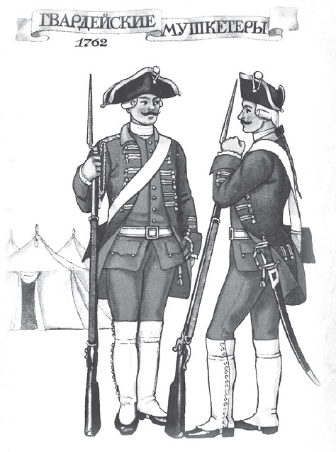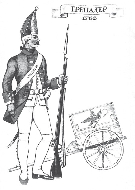 Какой же она была, русская армия? Пехота была двух видов, гренадёры и мушкетёры. Мушкетёр – это просто стрелок. А в гренадёры отбирали самых рослых и сильных. Когда-то они должны были бросать ручные гранаты. Это был железный мячик, наполненный порохом, из него торчал фитиль, поджигаешь и кидаешь. Но такие гранаты были очень ненадёжными. Или фитиль погаснет, и граната не взорвётся. Или взорвётся у тебя в руках, перебьёт своих. Гранаты отменили. А гренадёры остались, но теперь этим словом называли отборных, сильных солдат. Как раз они первыми шли в штыковые атаки.