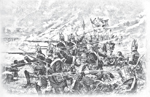 Ружья были гладкоствольными (без нарезок в стволе, направляющих пулю). Стреляли на небольшие расстояния, и пуля летела не точно. Как-то прицелиться, чтобы попасть в противника, можно было только на 60–80 шагов. Поэтому в европейских армиях солдат вообще не учили меткой стрельбе. Вместо того, чтобы прицеливаться, стреляли залпами. Наводили ружья в сторону неприятельского войска и палили все вместе – чьи-нибудь пули попадут. Даже поговорка была: «Пуля виноватого найдет».