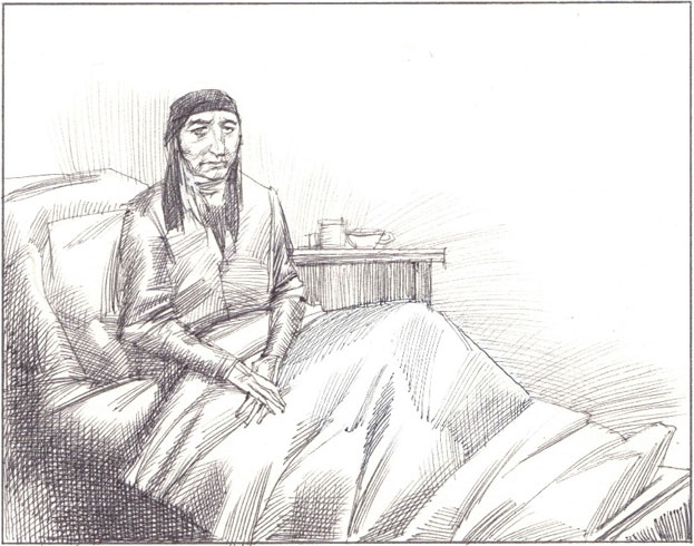 Это стонет и причитает бабушка Абигай. Бледная, исхудавшая, сидит она в своей кровати. Хотя и облокотилась о подушки, поза напряженная, неестественная. Это потому, что бабушкины ноги, от самых ягодиц до пяток, прибинтованы к доске…