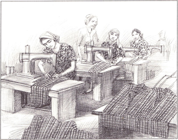 Ниточка на губе была почти у каждой швеи. Ниточка помогала им сосредоточиться во время шитья. Все при деле: руки, ноги, глаза и даже губы.