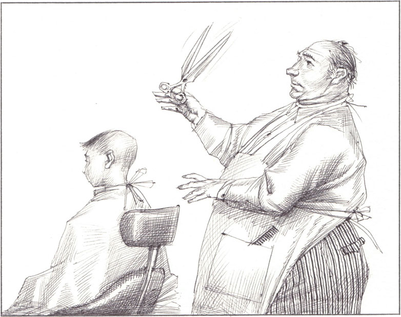 Просторная, светлая парикмахерская – она занимала угол здания – была обставлена скромно: всего два кресла и три стула для ожидающих. На тумбочке жужжал вентилятор с резиновыми лопастями, по радио звучала негромкая музыка. Оба кресла были заняты клиентами. Мы уселись на стулья и сразу же превратились в зрителей, приглашенных на интереснейший спектакль. Актеры, то есть парикмахеры, были, как врачи, в белых халатах. Тот, что постарше – он несомненно играл главную роль – ловко орудовал то машинкой, то ножницами. Руки его так и мелькали: вверх, вниз, вправо, влево… Возле кресла он крутился, как фигурист на катке. Толстый живот не позволял ему плотно придвигаться к креслу, он работал, смешно вытянув руки. Может быть, поэтому казалось, что мастер стрижет наощупь, не глядя. Вот-вот срежет клиенту ухо, думал я. Срежет и даже не заметит! Засыплет пудрой. А потом второе отрежет и тоже запудрит. И отпустит клиента. А тот встанет с кресла – и тоже ничего не заметит! Ведь симметрия не нарушилась… Он даже не поймет, что уже оглох (я думал, что именно так происходит, когда отрезают уши), а только мотнет головой – спасибо, мол, хорошо постриг, ничего не торчит… И уйдет…