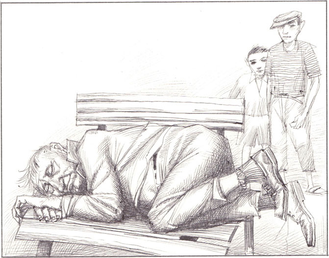 «Хмырь» – это прозвище произносилось гораздо чаще, чем его имя Анатолий, – мужик лет сорока пяти, проживал в одном из домов неподалеку. Это был опустившийся пьяница, которого мы редко видели трезвым. Правда, в отличие от других алкоголиков, Хмырь не буянил, не крыл матом нас, пацанов. Идет себе, бывало, покачиваясь, зигзагами, по нашей улице, а когда больше идти не в силах, мирно укладывается спать на одной из скамеек у подъезда. Подложит руки под голову, согнет ноги в коленках – и похрапывает, как на мягкой постели…