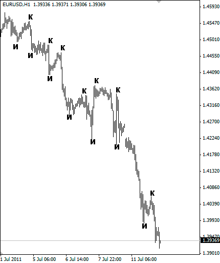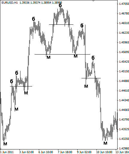 Рисунок 1.1. Примеры ценовых волн на графике EURUSD