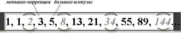 Точно так же, если взять из ряда Фибоначчи два рядом стоящих числа, допустим, 3 и 5, то всегда можно безошибочно определить, которое из них большее, а которое меньшее. Это, в свою очередь, означает, что, имея под рукой конкретный ценовой график, мы можем с большой долей вероятности, определить, какая волна является импульсивной, а которая коррекционной.