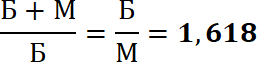 Таким образом, золотое сечение отрезка возможно только тогда, когда части составляют значения 0,382 и 0,618. В таком случае деление отрезка единичной длины на две неравных части будет соответствовать правилу «золотого сечения», так как при этом большая часть отрезка будет относиться к меньшей части точно так же, как и весь отрезок будет относиться к части, и наоборот (рис. 2.2). Если все сказанное выше записать в формульном виде, тогда можно получить достаточно простое соотношение, отражающее условия «золотого сечения», где М означает меньшую часть отрезка, Б – большую часть, а М + Б – целый отрезок.