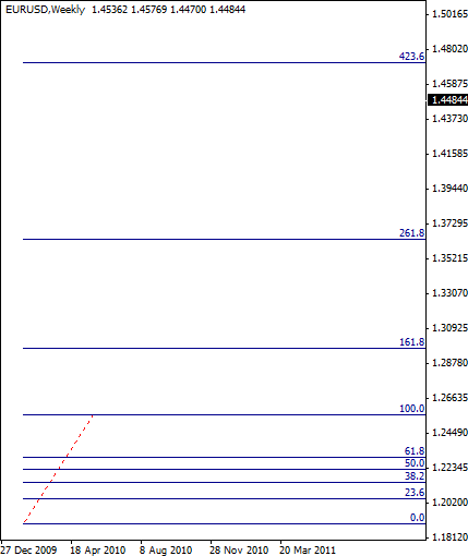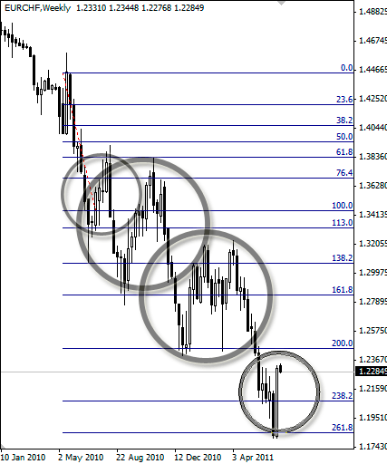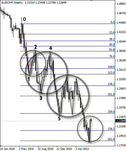 Ниже представлен пример построения линейки Фибо на недельном графике пары EURCHF (рис. 2.4). На первый взгляд может показаться, что представленные здесь уровни коррекции Фибо напоминают собой хаотическое нагромождение бесполезных линий, однако это не так. Стоит только отбросить несколько ненужных уровней, которые, как правило, лежат в диапазоне от 76 до 23 %, как все остальные линии начинают формировать стройную волновую картину. (Естественно, при условии, что линейка правильно построена.) Обратите внимание, как коррекционные волны практически точно вписываются в существующие границы: