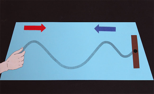 По веревке начинает бежать волна, которая затем отразится. Мы продолжаем качать свободный конец веревки. Волны, бегущие в прямом и обратном направлениях, складываются. Но мы видим полный беспорядок.