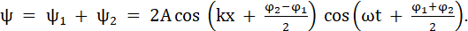 Чтобы привести это уравнение к более простому виду, выберем точку начала отсчета x, так чтобы разность φ2–φ1 стала равной 0. Аналогичным образом поступим и с точкой начала отсчета t. Ее выберем так, чтобы сумма φ1+φ2 тоже стала равной 0.