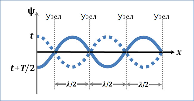 Из этих формул следует, что расстояние между соседними пучностями, так же как и расстояние между соседними узлами, равно λ/2. Пучности и узлы сдвинуты друг относительно друга на четверть длины волны λ/4.