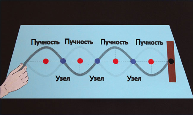 Итак, мы познакомились с простейшей иллюстрацией стоячих волн. Теперь давайте разберем стоячие волны с точки зрения физики.