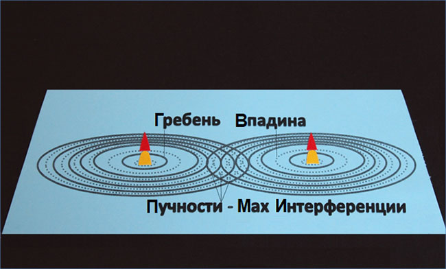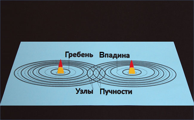 Интерференция волн – сложение когерентных волн с образованием устойчивой картины максимумов и минимумов амплитуды колебаний. На примере ниже мы видим, что в тех точках среды, где гребни волн складываются со впадинами, образуются узлы (стоячих волн), называемые минимумами интерференции: