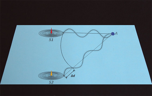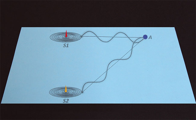 Теперь выберем некоторую произвольную точку А, в которой будем фиксировать наложение волн, испущенных источниками S1 и S2.