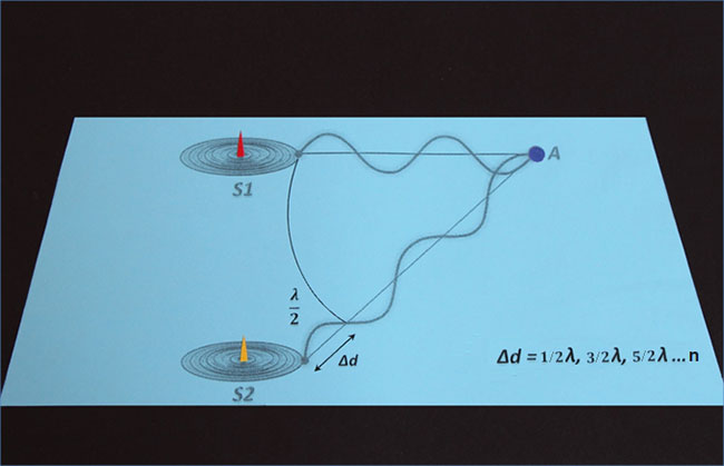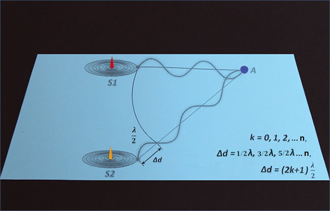 Тогда в точку А волны придут в противофазе, то есть гребень источника S2 придется на впадину источника S1. В результате такого наложения волн произойдет их ослабление друг другом и в точке А образуется интерференционный минимум (узел стоячей волны).