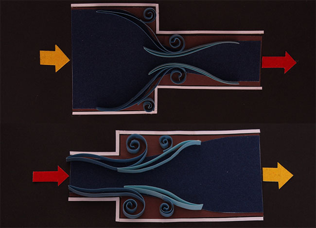 В результате этого образуются зоны вихреобразования, которые возникают в кольцевом пространстве вокруг суженной части потока.
