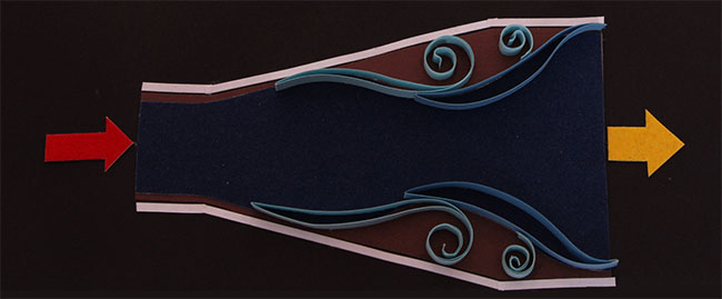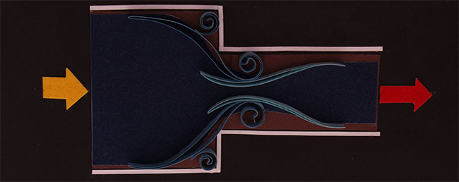 Таким образом, при сужении русла происходит увеличение скорости движения потока и снижение давления, то есть преобразование потенциальной энергии давления в кинетическую энергию движения жидкости.
