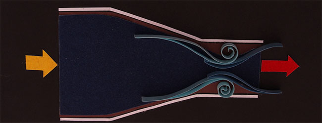 Очень часто зоны вихреобразования (циркуляции) возникают сразу после суженной части потока, проявляясь в виде пены по краям основного течения.