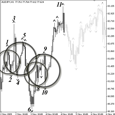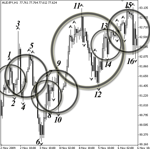 Таким образом, мы проследили с вами пошаговую процедуру преобразования механически нанесенных ценовых экстремумов при помощи индикатора fractals и тех фильтров, которые мы рассмотрели с вами ранее. Ниже представлен законченный вариант выделения волн при помощи сортировки ложных фракталов, на основе чего произведена последовательная нумерация «истинных» экстремумов. Соединяя эти точки линиями, мы можем получить готовый график волновой картины рынка, откуда уже появляется возможность не только фиксировать волновые модели, но и выделять гармонические циклы (рис. 3.9).