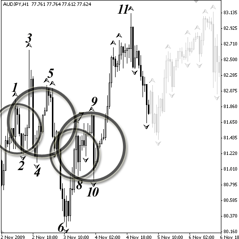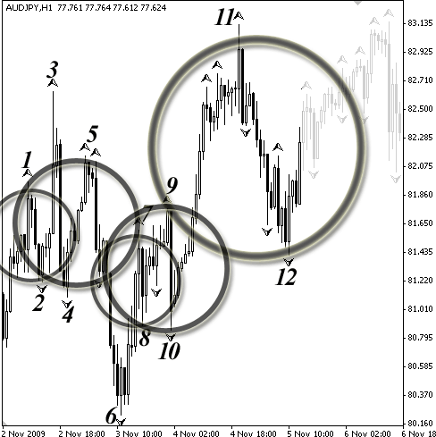 Поэтому, как только цена формирует новый минимум, где также образуется нижний фрактал, мы считаем, что предыдущий фрактал был ложным, и переносим нашу метку на вновь сформированный ценовой экстремум. Теперь наша задача заключается в том, чтобы подтвердить данный фрактал, поэтому, как только цена уходит на расстояние минимальной величины шага, мы присваиваем текущему минимуму порядковый номер 12 и закрепляем его на ценовом графике, рисуя при этом большую окружность, проходящую через точки № 11–12 (рис. 3.8).