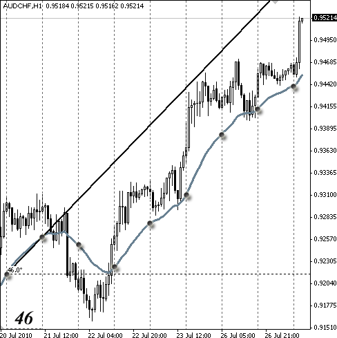 Циклические линии нам понадобятся для того, чтобы с их помощью можно было получить одинаковые интервалы на ценовом графике. Затем полученные интервалы будут использоваться нами для того, чтобы с помощью них можно было определить угол наклона средней скользящей ЕМА в каждом конкретном участке графика. Для этого мы будем использовать инструмент – трендовая линия по углу (рис. 3.10).
