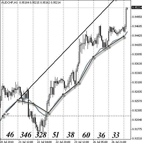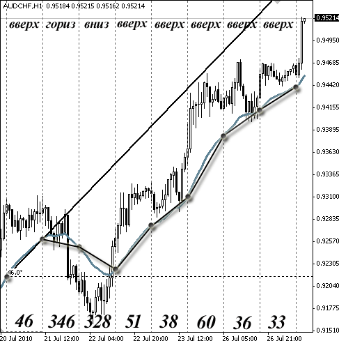 Соединяя последовательно точки наклонной линией, определяющей угол, можно получить соответствующие значения углов для каждого участка графика (рис. 3.11). В дальнейшем эти данные мы будем использовать для того, чтобы определить направление текущего тренда в каждом конкретном участке графика. Для этого я воспользовался следующей идеей: угол от 2700 до 900 (вертикально вниз и вертикально вверх) я разделил на три равных части, для того чтобы отождествить их с тремя равноправными состояниями рынка – нисходящим трендом, восходящим трендом и флэтом. Вот что у меня получилось: