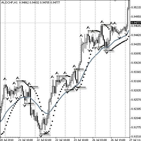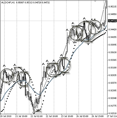 • если индикатор ЕМА демонстрирует горизонтальное направление, ищем место, где Параболик находится и под, и над ценой, а затем фиксируем точку пробоя любой из этих линий. После чего открываем сделку в сторону пробития.