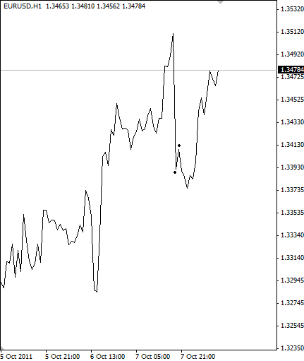 Поэтому, для того чтобы свести к минимуму возможные ошибки, я решил использовать линейный график, который поможет нам с минимальными ошибками выделить все ценовые колебания, включая даже самые мелкие, самые незначительные всплески. Для тех, кто не знает, что такое линейный график и как он строится, отмечу, что линейный график, как правило, строится на основании одной какой-либо цены, например цены закрытия, выстраиваясь в виде линии, соединяющей последовательно точки цен закрытия. В результате этого мы увидим однозначную ценовую линию, которая позволит нам рассмотреть и зафиксировать все волны, вплоть до самых мельчайших ценовых колебаний. Ниже приведен пример линейного графика (рис. 4.1), на котором в центре двумя точками выделена интересующая нас коррекционная волна.