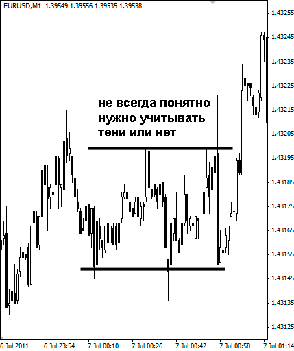 Поэтому многие трейдеры для себя избирают один, какой-то конкретный способ выделения волн и таким образом пытаются избежать субъективизма. Некоторые, например, выделяют волны всегда по максимальным и минимальным ценам, т. е. «по теням». Другие, независимо от текущей рыночной ситуации, всегда предпочитают строить «по телам», т. е. по ценам закрытия и открытия. Кстати, похожую проблему можно встретить и в классическом техническом анализе, где до сих пор идут споры относительно того, как правильно проводить построение трендовых линий и уровней поддержки-сопротивления: по телам, по теням или еще как-то.