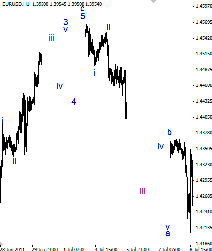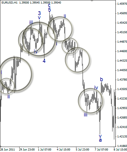 Именно такие периоды ценового графика являются наиболее проблематичными с точки зрения их трактовки. Что и говорить, такие участки не так просто правильно разложить с первого раза, и поэтому приходится по несколько раз «прогонять» их, рассматривая различные варианты учета волн. Но вернемся к нашему графику.