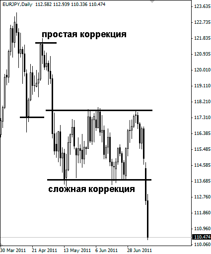 Вторая разновидность коррекции подразумевает волны простой формы. Можно сказать по-другому – это классический откат в виде направленного движения, без каких-либо значительных внутренних структур. При этом их очень часто можно спутать с импульсивной волной, хотя они таковыми не являются. Именно по этой причине такие коррекционные волны получили название «простые». На представленном графике простая коррекция выделена в верхней его части (рис. 4.6).