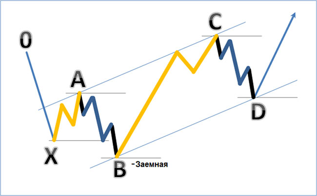 В этом варианте заемной (знак минус указывает на принадлежность заемной волны к медвежьему тренду) волной выступает желтый зигзаг на участке BC. Заемной эта модель становится в тот момент, когда на графике возникает медвежья модель –S (синяя –S-пятиволновка на участке CD), минимум которой не преодолевает предыдущий лоу в точке B. Отсюда и возникает искажение. Получается, что цена растет, но при этом формируются медвежьи модели.