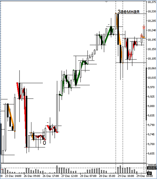 Тем не менее у одной из этих формации (у ценового спада в виде большой медвежьей свечи) условия формирования именно бычьей модели выполнены не полностью. Поэтому я и называю ее заемной волной.