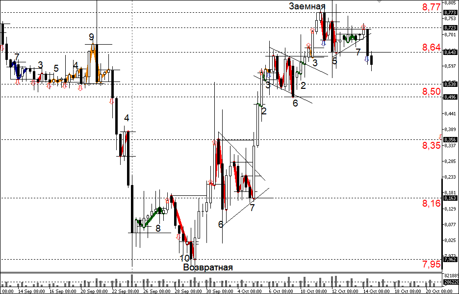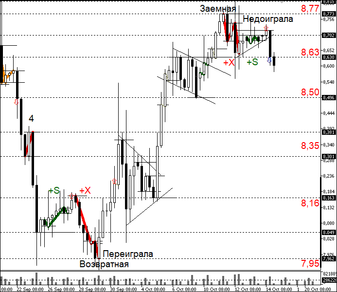 Рыночное искажение исчезло в пятницу 14 октября, когда цена опустилась ниже отметки 8,64. На тот момент в волновом балансе зафиксировалась четная пара (+X+S вверху графика), в которой последняя зеленая пятиволновка (модель +S) оказалась укороченной (так как ее максимум не смог преодолеть значения 8,77).