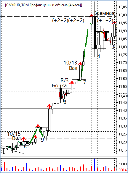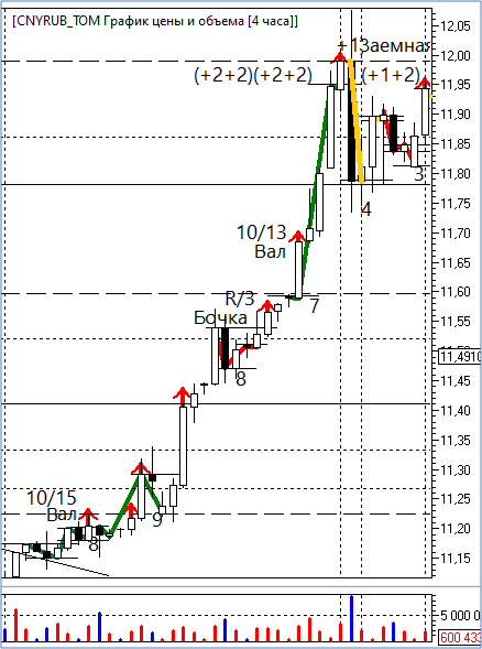 Тем не менее и до, и после заемной волны тренд-вектор демонстрирует восходящее направление, поэтому, чтобы в волновом балансе не было разрыва, я отношу эту волновую конструкцию к моделям роста. Получается, рынок как бы на время занял ее у медведей и отдал быкам.