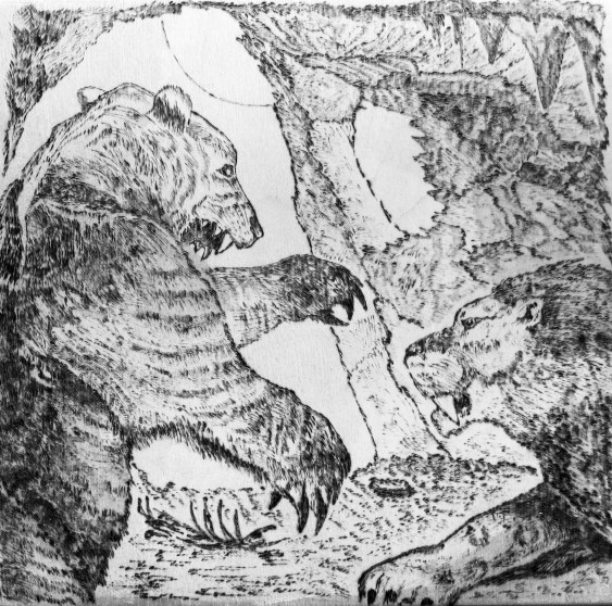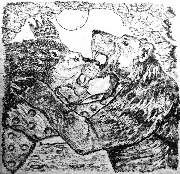 Пещерный медведь, грузно шагая, раздражённо ворча, дошёл до конца коридора в пещере, остановился, ещё раз всё тщательно обнюхал и, сметая оглоданные кости животных, завернул вправо, проникнув тем самым в логово пещерника. Лев уже стоял на четырёх лапах с высоко поднятой мордой и полуоткрытой пастью. Его короткий с кисточкой хвост нервозно обстукивал бока. Медведь сбавил шаг и остановился в нескольких шагах от хозяина пещеры. Лев угрожающе зарычал, сотрясая своды своего каменного жилища, и обнажил грозное оружие – огромные клыки верхней челюсти. Чудовищные мышцы царственного хищника напряглись в ожидании предстоящей схватки, мощная грудь его начала вздыматься, словно меха. Косолапый стоял перед хозяином необъятной мрачной глыбой в позе извиняющегося с опущенной к низу мордой, но с решимостью в красных от прихлынувшей крови глазах, злобно исподлобья глядевших на пещерника. В этих глазах большой лев прочёл лишь одно: могучий медведь пришёл к нему в логово, гонимый необузданным желанием завладеть пещерой во что бы то ни стало.