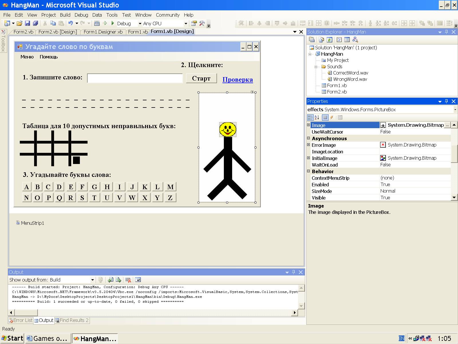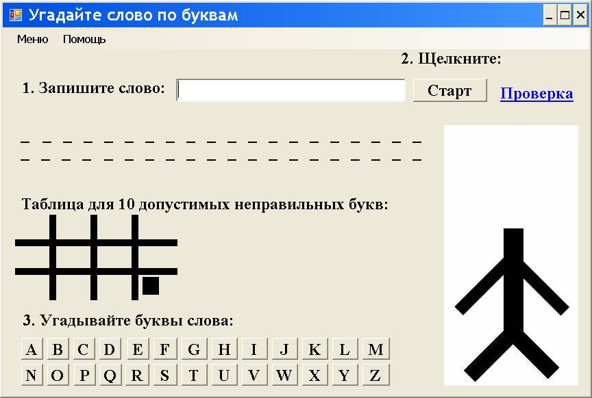 В компьютерном варианте эту игру мы будем разрабатывать, следуя проекту Hang Man автора Ibrahim от 1.3.2005 с сайта www.planet-source-code.com, но с нашими усовершенствованиями для современной версии Visual Studio.
