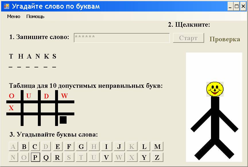 10. Теперь участники игры могут поменяться ролями. Аналогично, сначала Игрок 1 при помощи клавиатуры записывает английскими буквами, причём только строчными буквами (без нажатия клавиши Shift) загаданное им слово в окно TextBox, например, слово thanks (благодарность).