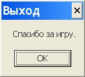 14. Появляется панель типа MessageBox с благодарностью “Спасибо за игру” (рис. 19.12).