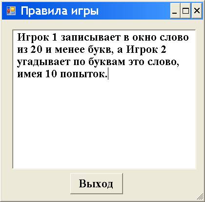 Сначала Игрок 1 при помощи клавиатуры записывает английскими буквами, причём только строчными буквами (без нажатия клавиши Shift) загаданное им слово в окно TextBox, например, слово exception (исключение). Даже первую букву имени собственного, например, имени человека, следует записывать строчной буквой.