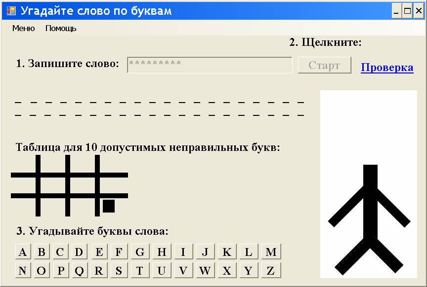 Опишем методику проектирования и программирования типичной и широко распространённой игры по угадыванию слова по буквам. Известно много вариантов этой игры как в ручном, так и в компьютерном варианте.