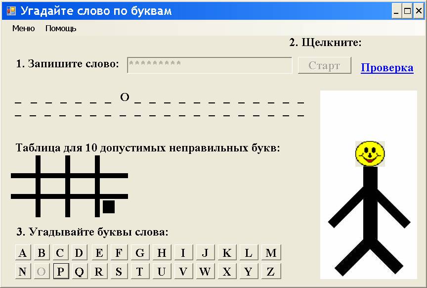 Игрок, угадывающий слово, будет воздействовать на кнопки типа Button с названиями букв из алфавита. После каждого щелчка игроком кнопки (мышью или клавишей Enter) искусственный интеллект анализирует событие, какую букву выбрал игрок, и выдаёт или мелодию для неправильного ответа, или мелодию для правильного ответа. Кроме того, при неправильном ответе искусственный интеллект будет выводить на форму смайлик (в виде известного графического файла) с недовольным изображением лица, а при правильном ответе – с довольным и улыбающимся изображением лица.
