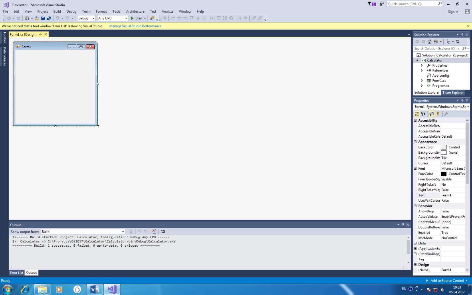 5. Несмотря на то, что мы не написали ещё ни одной строчки программного кода, приложение уже должно работать в любой версии Visual Studio. Для проверки работоспособности приобретенной нами Visual Studio выполняем построение программы: