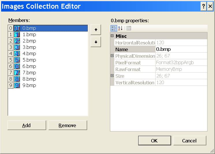 С панели инструментов Toolbox переносим на форму компонент типа списка рисунков ImageList, который, как компонент, размещается ниже формы. В панели Properties в свойстве Name изменяем его имя на numbers (цифры для подсчёта очков), а в свойстве ImageSize увеличиваем цифры до размеров 26; 67. Чтобы этот компонент заполнить цифрами для подсчёта очков, в панели Properties щёлкаем свойство Images, в появившейся панели Images Collection Editor щёлкаем кнопку Add (рис. 20.13). В приведённой выше панели Open находим (например, в папке с загруженными из Интернета файлами) графический файл 0.bmp и щёлкаем кнопку Open, после чего этот рисунок мы увидим в панели Images Collection Editor. Аналогично в список рисунков ImageList добавляем остальные цифры 1, 2, 3, …, 9.