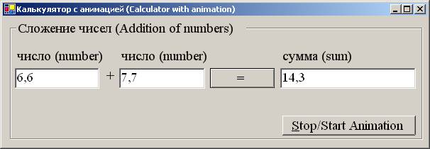 На этой форме с заданной нами частотой в 500 миллисекунд (или 0,5 секунды) заголовок “Калькулятор (Calculator)” сменяется на “Калькулятор с анимацией (Calculator with animation)” (рис. 2.11), и таким образом создаётся эффект анимации.